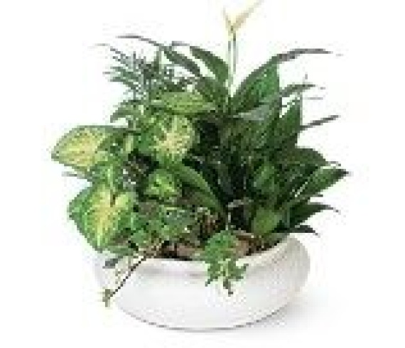 A lovely array of cheerful plants is just the right size for a mid-size desk or table. It's also just the right choice for that special someone. It may contain, Dracaena, ivy, palm and syngonium plants arrive in a low decorative bowl. This is in a 8" container and height of 10" tall. Plant selection and container style/color will vary based on availability.
